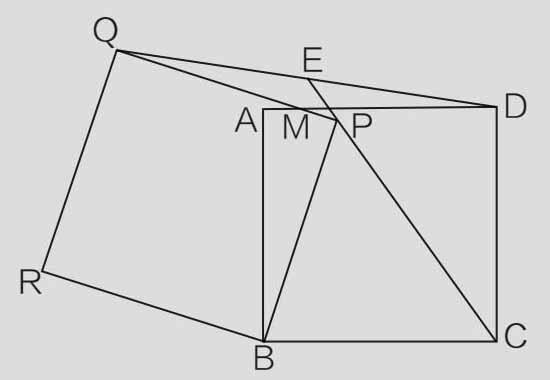 正方形 ABCD 绕 B 逆时针旋转任意角度得正方形 BPQR,连 QD,连 CP 交 QD 于 E。