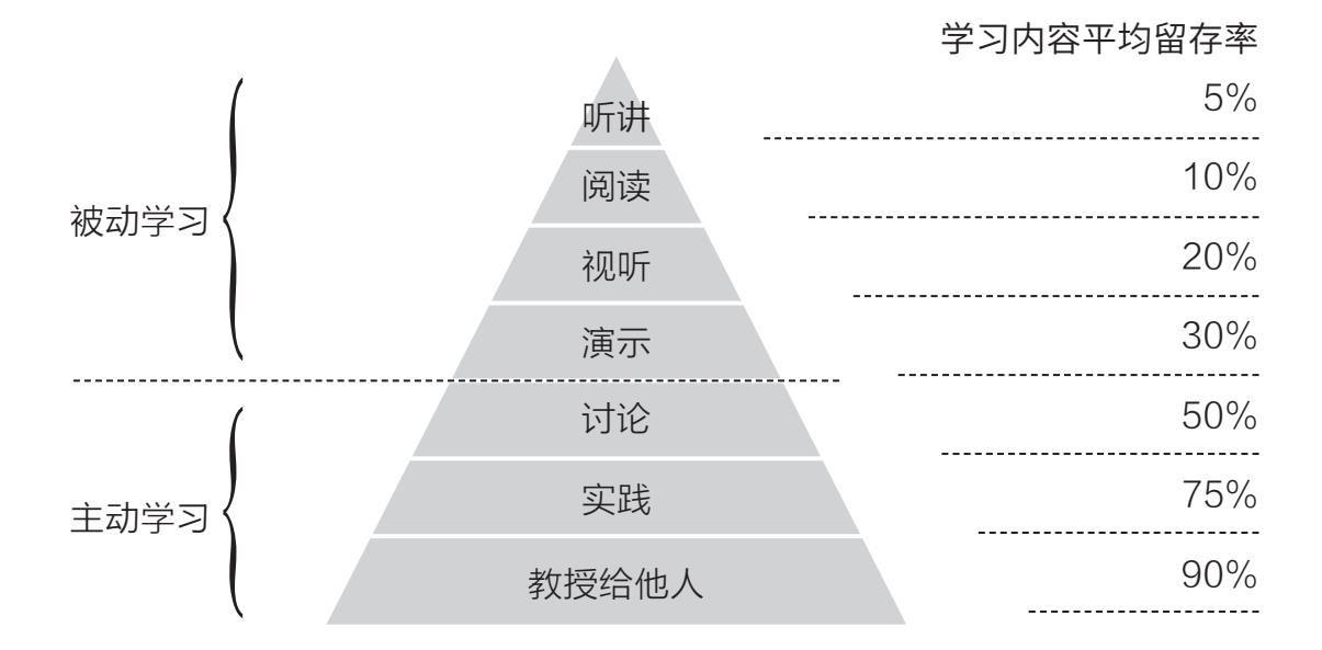 在很多年前,中国的网络上开始流行一种叫作学习金字塔的理论。该理论主要是讨论、实践、教授给他人的主动学习方式,比听讲、阅读、试听和演示等被动学习方式的效果更好。该理论还伴有一张被广泛流传的图,如图 3–1 所示。