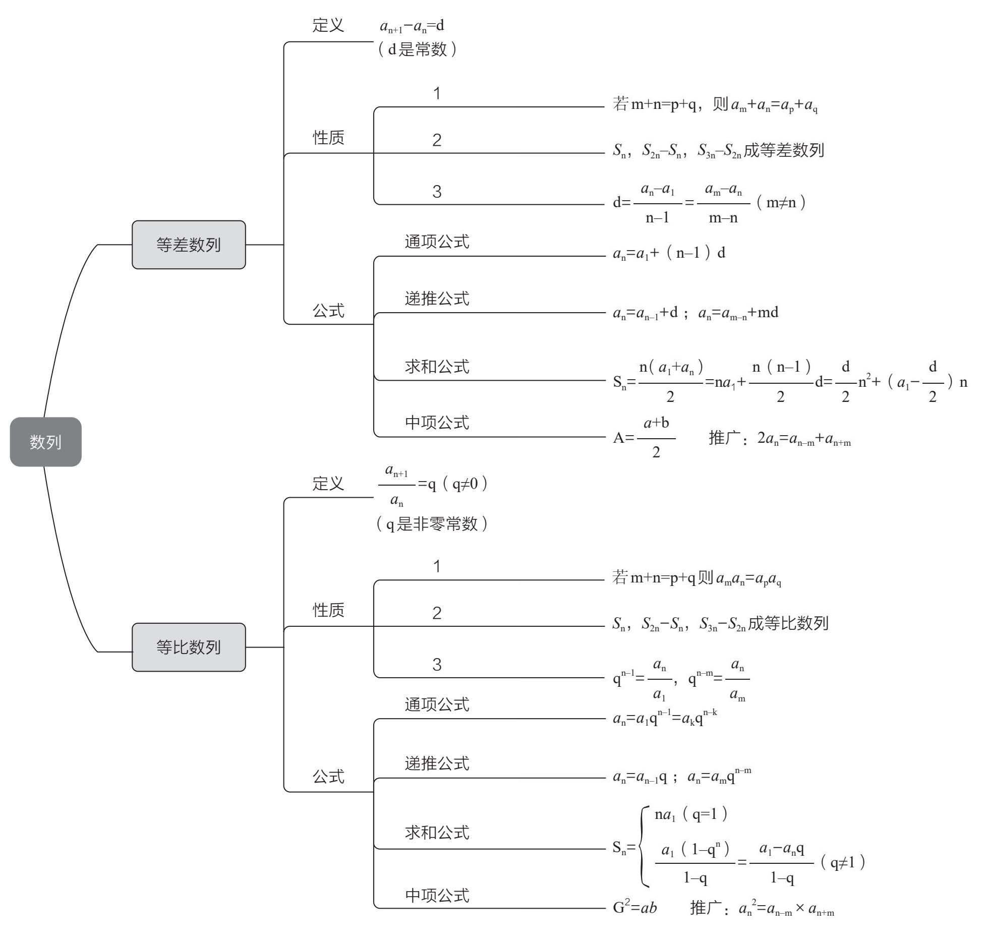具体来说,由于商业机构的局限性,学生对思维导图的使用基本局限于进行知识整理这一类方式。他们费大力气把课本中的知识点画在一张纸上,很多时候就是把书中的知识点手工抄写了一遍——这也会产生一点效果,但是能产生多少呢?比如高中数学知识的思维导图做出来经常是这个样子,以数列章节为例,如图 4–6 所示。