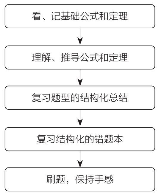 我们先从偏理解性的学科开始讲解,典型的如数学和物理。总体来说,数学、物理学科的复习以基础公式、定理为起点,以题型为核心,其中数学偏向题型变化,物理偏向原理理解。正如图 5–5 所示,高效的复习流程是: